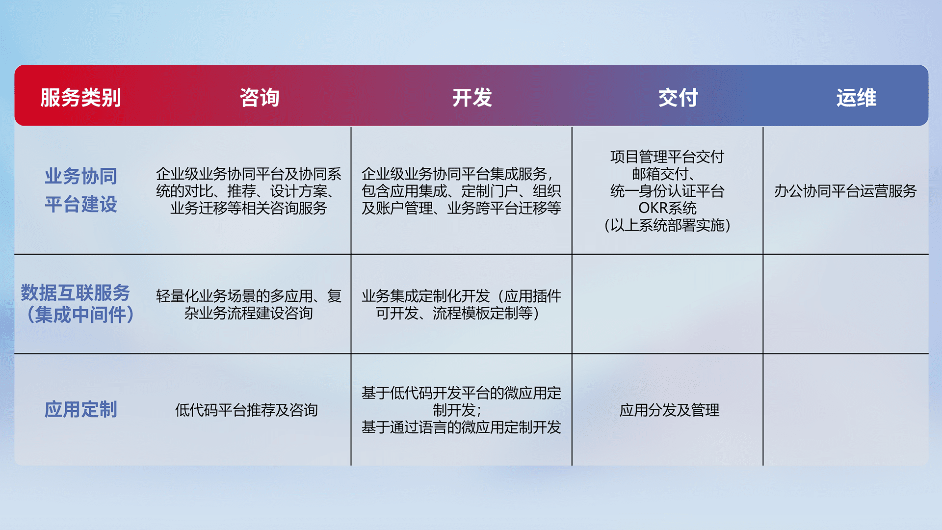 针对钉钉、、、、企微、、IDaas等平台级产品提供产品的规划、、方案、、、交付、、、定制化开发等服务,,实现如统一协同办公、、智能客户服务、、、、混合会议管理、、、、智能数据查询、、、、等业务场景,,实现数字化转型。。。。